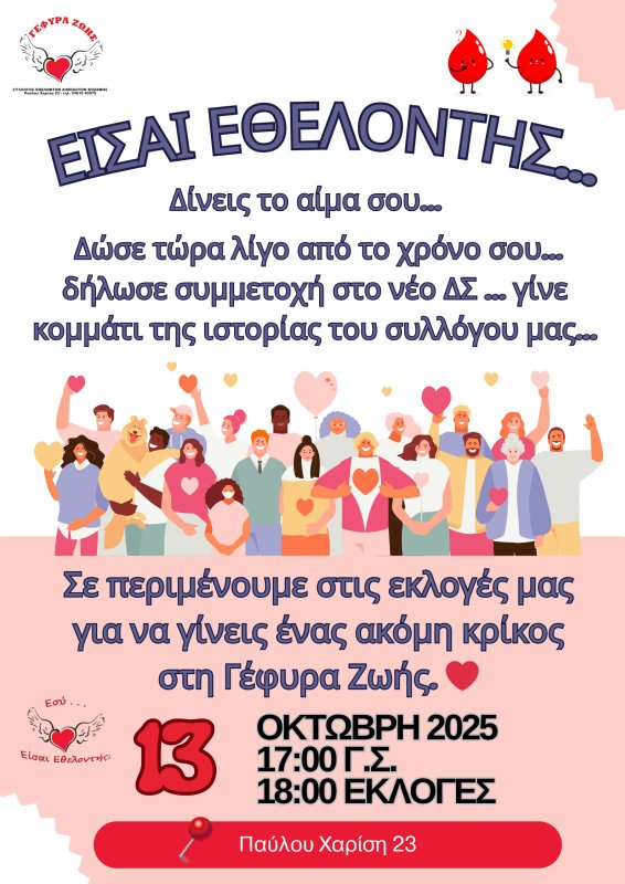 Το Δ.Σ. του Συλλόγου Εθελοντών Αιμοδοτών Κοζάνης «Γέφυρα Ζωής», καλεί τα μέλη του σε Γενική Συνέλευση – επαναληπτική – ΤΕΛΙΚΗ τη Δευτέρα 13 Οκτωβρίου 2025 και ώρα 17:00 στο γραφείο του Συλλόγου, στην οδό Παύλου Χαρίση 23 στην Κοζάνη.