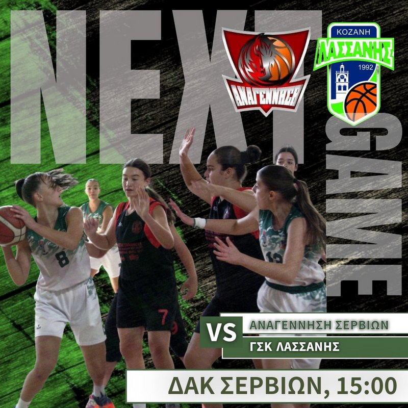 Το μεσημέρι του Σαββάτου, 18/10 οι νεανίδες του Γ.Σ.Κ ΛΑΣΣΑΝΗ, θα αγωνιστούν στο κλειστό γήπεδο των Σερβίων με την ομάδα "ΑΝΑΓΕΝΝΗΣΗ ΣΕΡΒΙΩΝ".