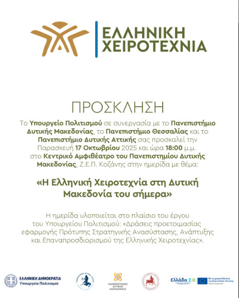 , ανακοινώνει τη διοργάνωση Ημερίδας με τίτλο «Η Ελληνική Χειροτεχνία στη Δυτική Μακεδονία του σήμερα».