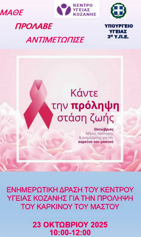 Κέντρο Υγείας Κοζάνης: Δράση με θέμα την πρόληψη του καρκίνου του μαστού, στην κεντρική πλατεία Κοζάνης, την Πέμπτη 23 Οκτωβρίου