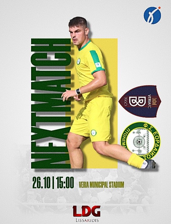 την ομάδα της Βέροιας, εκτός έδρας. Ο αγώνας έχει οριστεί για την ερχόμενη Κυριακή, 26 Οκτωβρίου, στις 15:00. Πρόκειται για ένα παιχνίδι με ιδιαίτερο ενδιαφέρον απέναντι σε έναν ιστορικό αντίπαλο, με τον οποίο έχουμε συναντηθεί αρκετές φορές στο παρελθόν. Η ομάδα μας θα επιδιώξει ένα θετικό αποτέλεσμα, όπως κάνει σε κάθε αναμέτρηση του πρωταθλήματος, συνεχίζοντας τη δυναμική της πορεία. Καλούμε τον φιλαθλο κόσμο να δώσει το “παρών” στο γήπεδο της Βέροιας και να στηρίξει την προσπάθεια των παικτών μας με την παρουσία του! Γραφείο Τύπου "Φ.Σ. Εορδαϊκός"
