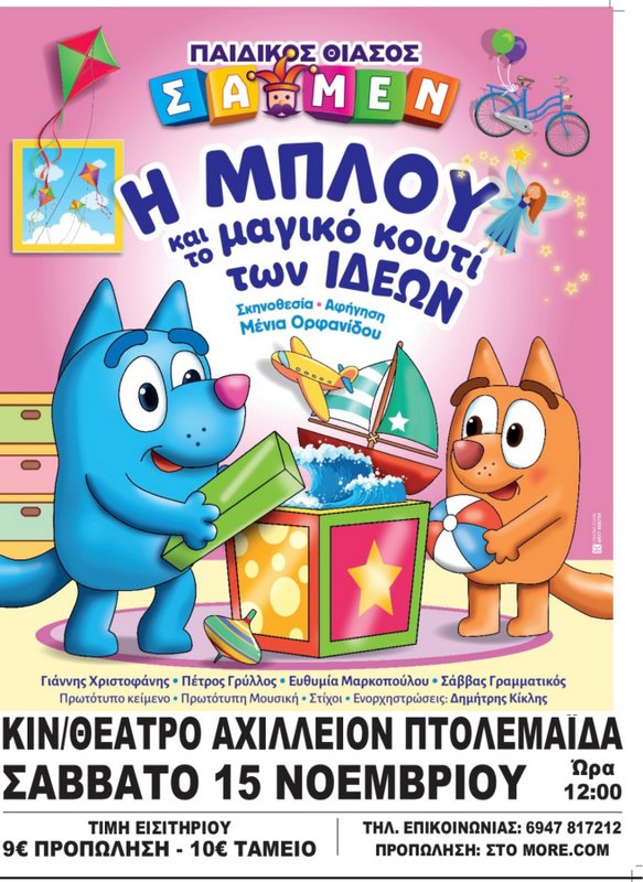 Η παιδική σκηνή ΣΑ🃏ΜΕΝ, μετά από τις δύο προηγούμενες sold out παραγωγές, παρουσιάζει φέτος το ολοκαίνουργιο θεατρικό έργο του Δημήτρη Κίκλη, " Η ΜΠΛΟΥ 🩵 και το μαγικό κουτί των ιδεών": μια τρυφερή, διαδραστική και ξεκαρδιστική περιπέτεια για παιδιά από 2 έως 102 ετών!