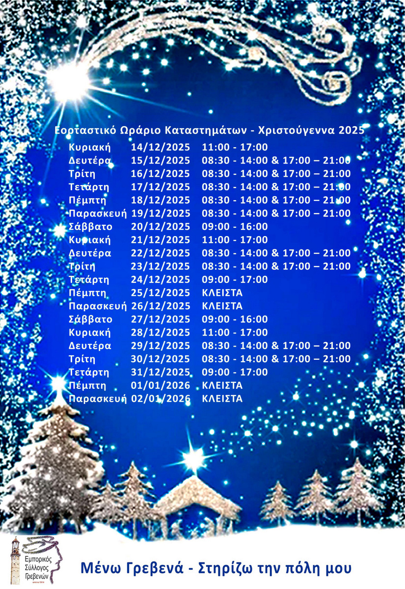 Ο Εμπορικός Σύλλογος Γρεβενών ενημερώνει το καταναλωτικό κοινό και τους επαγγελματίες της πόλης ότι στις 14-12-2025 τίθεται σε ισχύ το εορταστικό ωράριο λειτουργίας των καταστημάτων για την περίοδο των γιορτών.