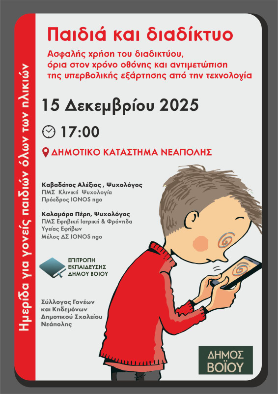 Ημερίδα με θέμα «Παιδιά και Διαδίκτυο: Ασφαλής χρήση του διαδικτύου, όρια στον χρόνο οθόνης και αντιμετώπιση της υπερβολικής εξάρτησης από την τεχνολογία» διοργανώνει ο Δήμος Βοΐου