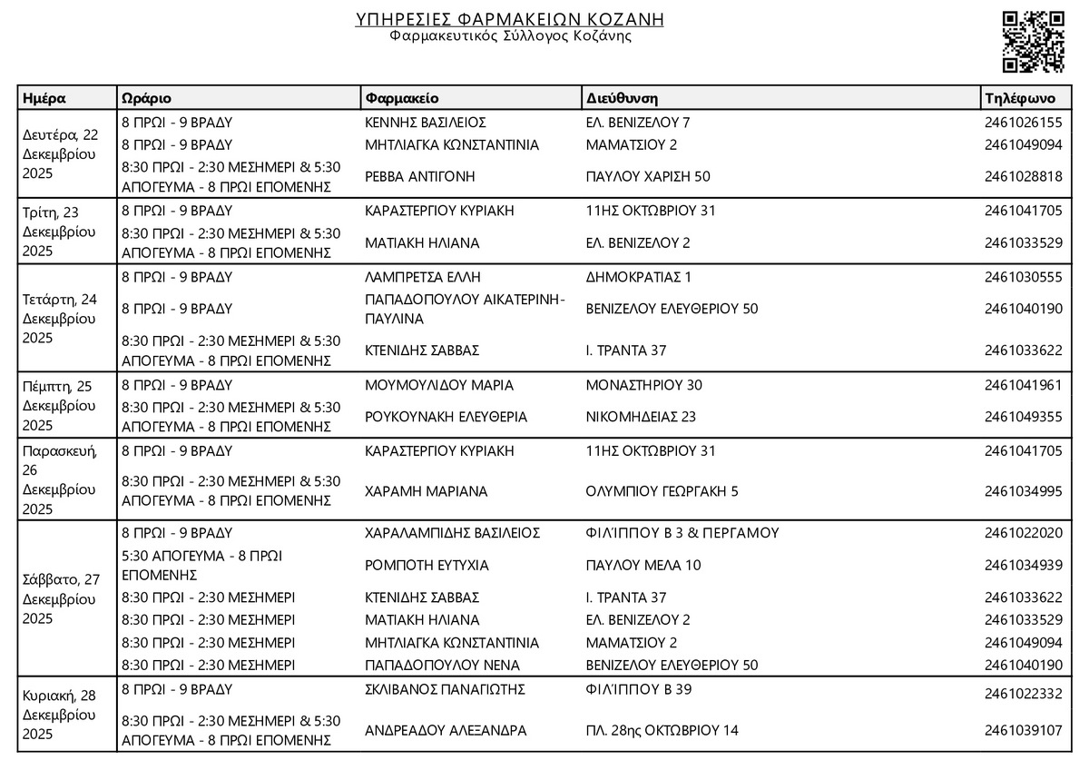 κοζάνη, ειδήσεις, νέα, ΠτολεμαΐδαΤα εφημερεύοντα φαρμακεία στην πόλη της Κοζάνης από Δευτέρα 22 έως Κυριακή 28 Δεκεμβρίου.