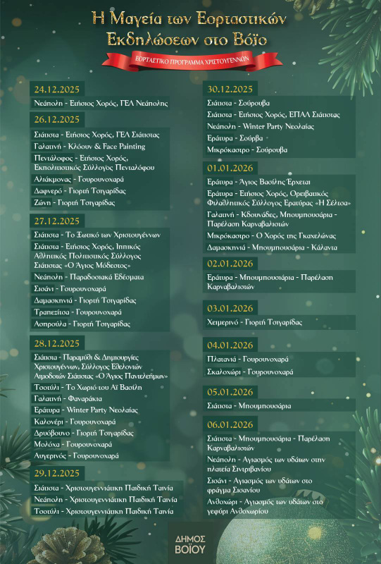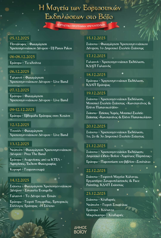 ✨🎶🎭 Οι εορταστικές δράσεις εξελίσσονται σε όλες τις Δημοτικές Ενότητες, με εκδηλώσεις για μικρούς και μεγάλους, πολιτιστικά δρώμενα, μουσική, παραδοσιακές εκδηλώσεις και στιγμές χαράς που ενώνουν τις τοπικές κοινωνίες. 👨‍👩‍👧‍👦🎁 Στόχος του Δήμου Βοΐου είναι να μεταφέρει το γιορτινό κλίμα σε κάθε χωριό και κάθε πόλη, ενισχύοντας την εξωστρέφεια, τη συμμετοχή των πολιτών και το αίσθημα της κοινότητας κατά τη διάρκεια των εορτών. 🏘️🤝📣 Καλούμε όλους τους δημότες και τους επισκέπτες να συμμετάσχουν στις εκδηλώσεις και να γιορτάσουν μαζί μας, στηρίζοντας τον πολιτισμό και την τοπική παράδοση. 🎉🎶🗓️Αναλυτικά το Πρόγραμμα:22.12.2025