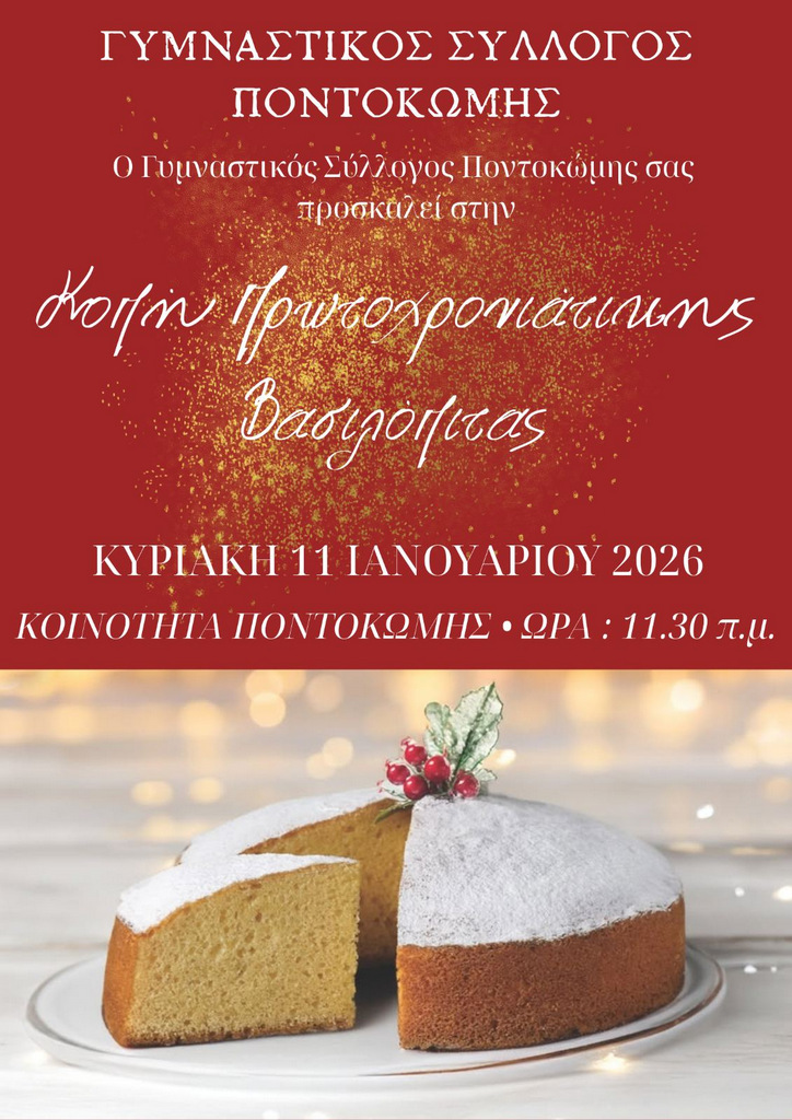 Ο Γυμναστικός Σύλλογος Ποντοκώμης προσκαλεί τα μέλη και τους φίλους του, στην κοπή της πρωτοχρονιάτικης βασιλόπιτας που θα πραγματοποιηθεί