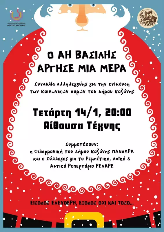 Ο Σύλλογος ΡΕ.Λ.Α.ΡΕ Κοζάνης (Σύλλογος για το Ρεμπέτικο, Λαϊκό και Αστικό Ρεπερτόριο) σας προσκαλεί στην Συναυλία Αλληλεγγύης για την ενίσχυση των Κοινωνικών Δομών του Δήμου Κοζάνης
