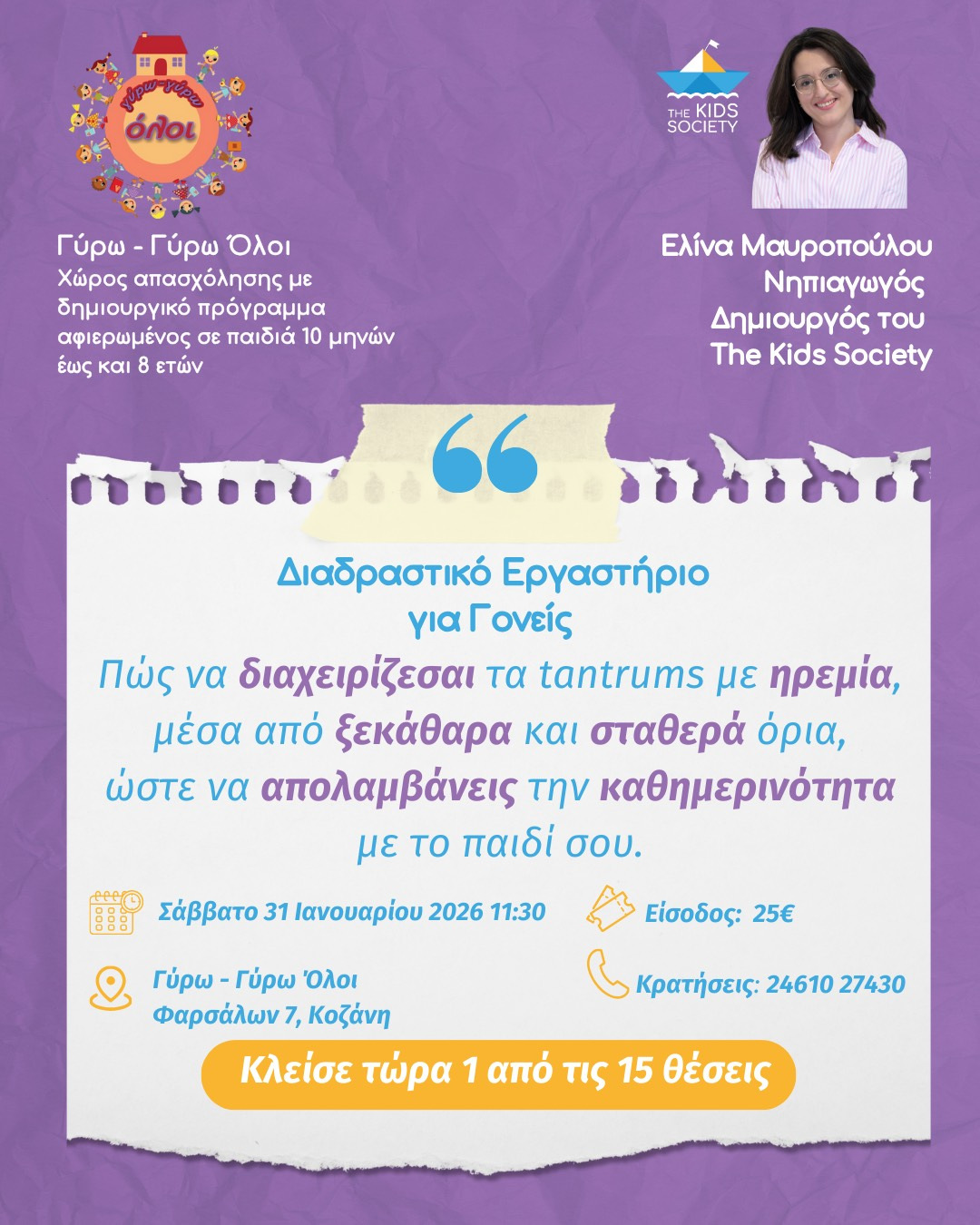 Έλα ν’ ανακαλύψουμε μαζί τον τρόπο. Στο σεμινάριο «Tantrums & Όρια: Από το Χάος στην Ηρεμία», δεν θα μιλήσουμε θεωρητικά. Βλέπουμε στην πράξη πώς διαχειριζόμαστε ένα ξέσπασμα τη στιγμή που συμβαίνει, αλλά και πώς το προλαβαίνουμε.