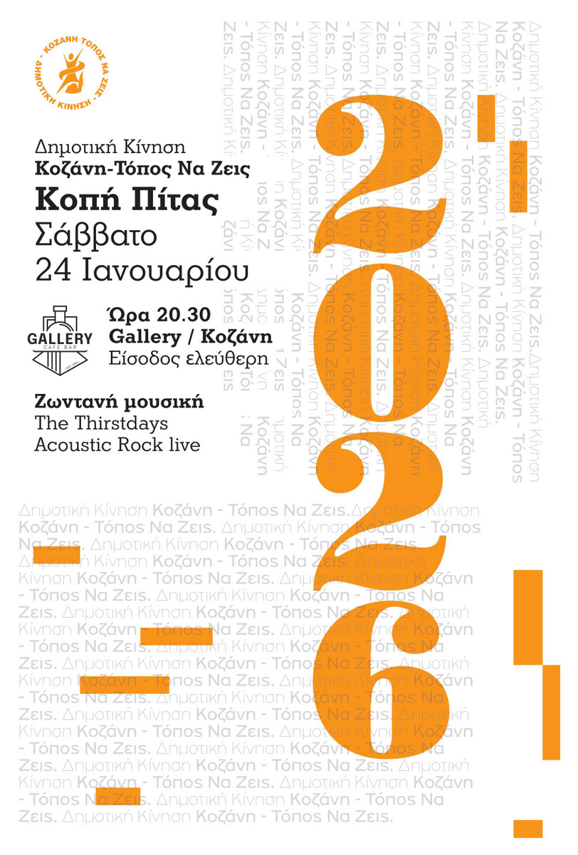 Η Δημοτική Κίνηση «Κοζάνη – Τόπος να Ζεις» σας προσκαλεί στην κοπή της πρωτοχρονιάτικης πίτας το Σάββατο 24 Ιανουαρίου 2025 και ώρα 20:30 Gallery Café Bar στην Κοζάνη.