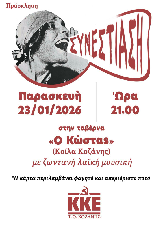 Παρασκευή 23/1, 9:00μμ, η Τ.Ο Κοζάνης του ΚΚΕ οργανώνει συνεστίαση στην ταβέρνα "ο Κώστας" , στα Κοίλα, με ζωντανή λαϊκή μουσική.