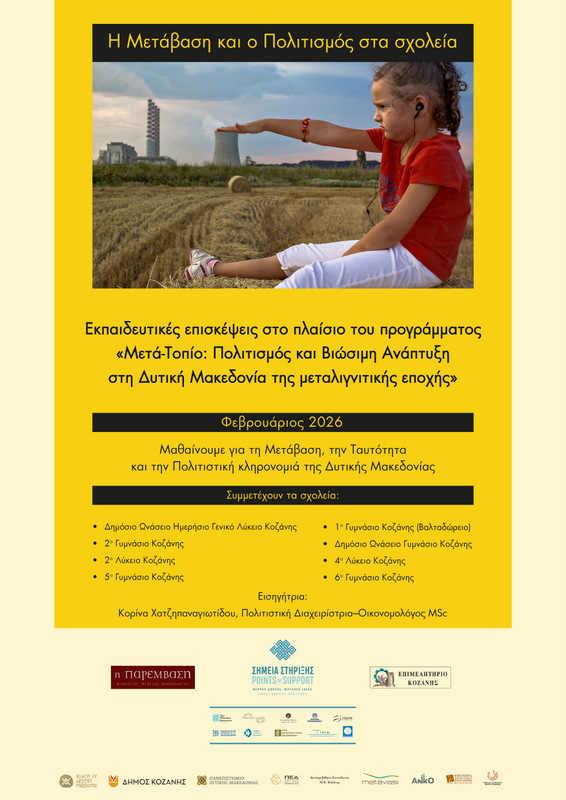, την Ταυτότητα και την Πολιτιστική κληρονομιά της Δυτικής Μακεδονίας. Η δράση εντάσσεται στο Project «Μετά-Τοπίο: Πολιτισμός και Βιώσιμη Ανάπτυξη στη Δυτική Μακεδονία της μεταλιγνιτικής εποχής», που υλοποιείται από την Εταιρεία Μελέτης Προβλημάτων Παρέμβαση, σε συνεργασία με το Επιμελητήριο Κοζάνης, και με τη συμμετοχή της Διεύθυνσης Β΄ βάθμιας Εκπαίδευσης Κοζάνης.