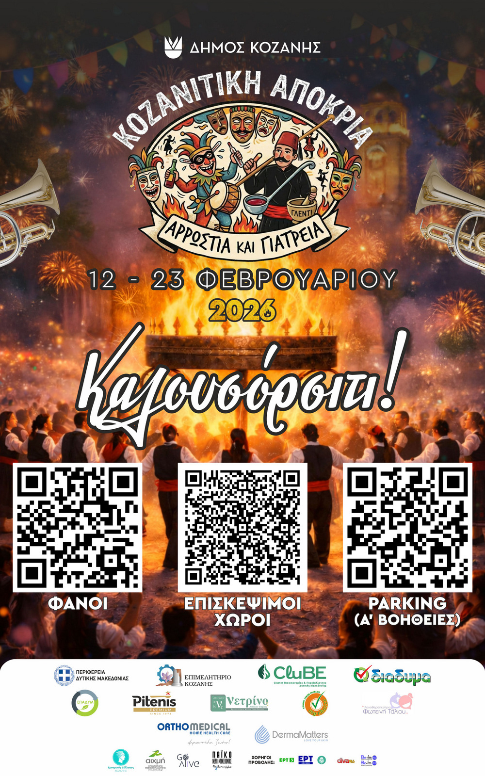 Παράλληλα, μπορείτε εναλλακτικά να σκανάρετε τα σχετικά qr code της Αποκριάτικής μας Αφίσας αλλά και να ξεναγηθείτε διαδικτυακά και στο site «Κοζανίτικη Αποκριά» (https://kozanitikiapokria.gr/), μαθαίνοντας αναλυτικά και τεκμηριωμένα, για το σπουδαίο μας έθιμο.