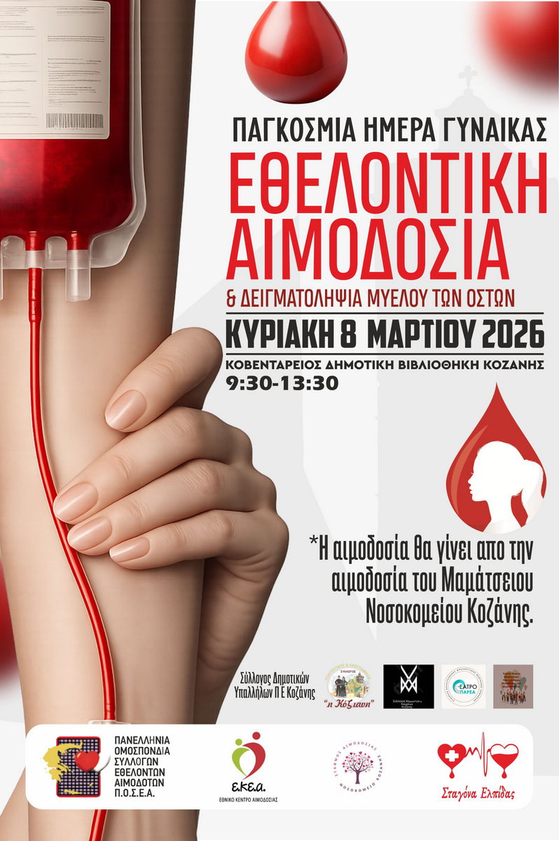 αιμοδοσία στη Δημοτική βιβλιοθήκη Κοζάνης και ώρες 9,30 με 13,30 με τη συμμετοχή του