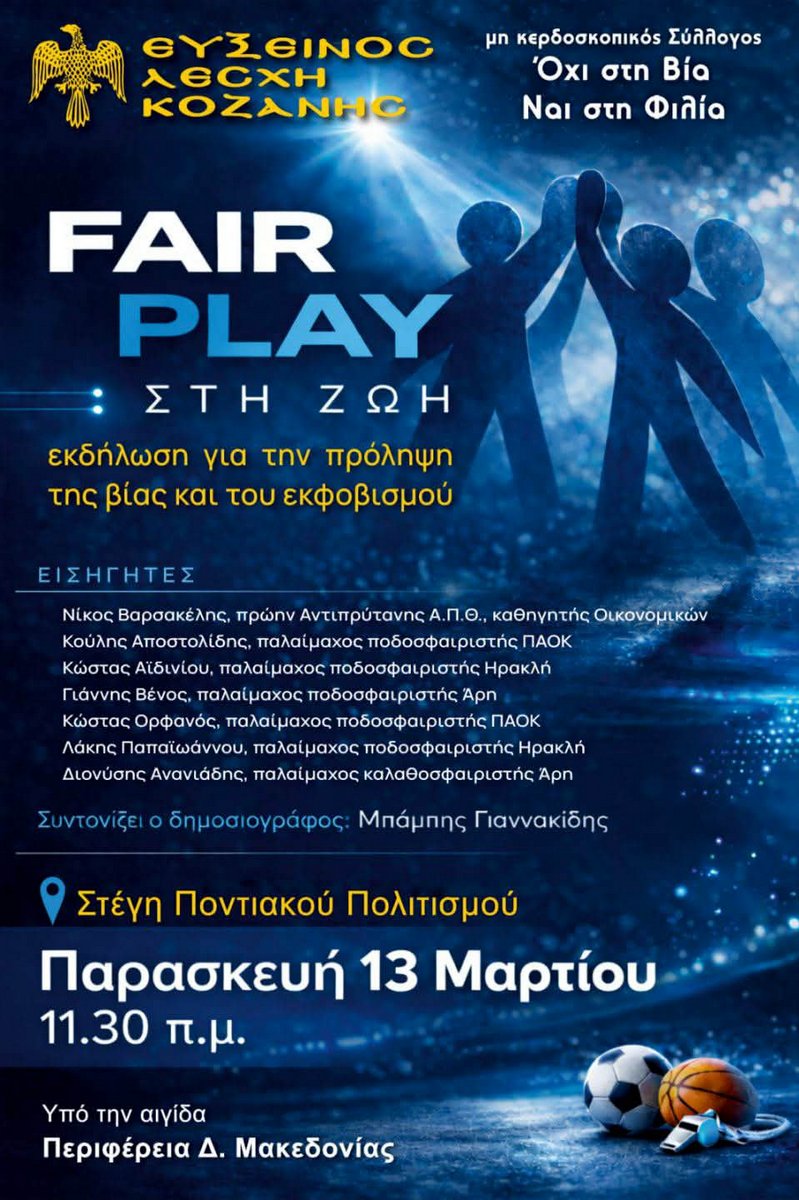 Ως εισηγητές στην εκδήλωση θα είναι ο πρώην αντιπρύτανης του Αριστοτελείου Πανεπιστημίου Θεσσαλονίκης και καθηγητής οικονομικών κ. Ν. Βαρσακέλης και ο Κοζανίτης βετεράνος ποδοσφαιριστής και απόφοιτος του Πανεπιστημίου Καλλιφόρνιας κ. Κ. Αποστολίδης. Θα υπάρξουν, επίσης, τοποθετήσεις, από παλαίμαχους αθλητές όλων των ομάδων της Θεσσαλονίκης (ΠΑΟΚ, Άρη και Ηρακλή), όπως ο Κώστας Αϊδινίου, ο Γιάννης Βένος, ο Κώστας Ορφανός, ο Λάκης Παπαϊωάννου και ο Διονύσης Ανανιάδης.