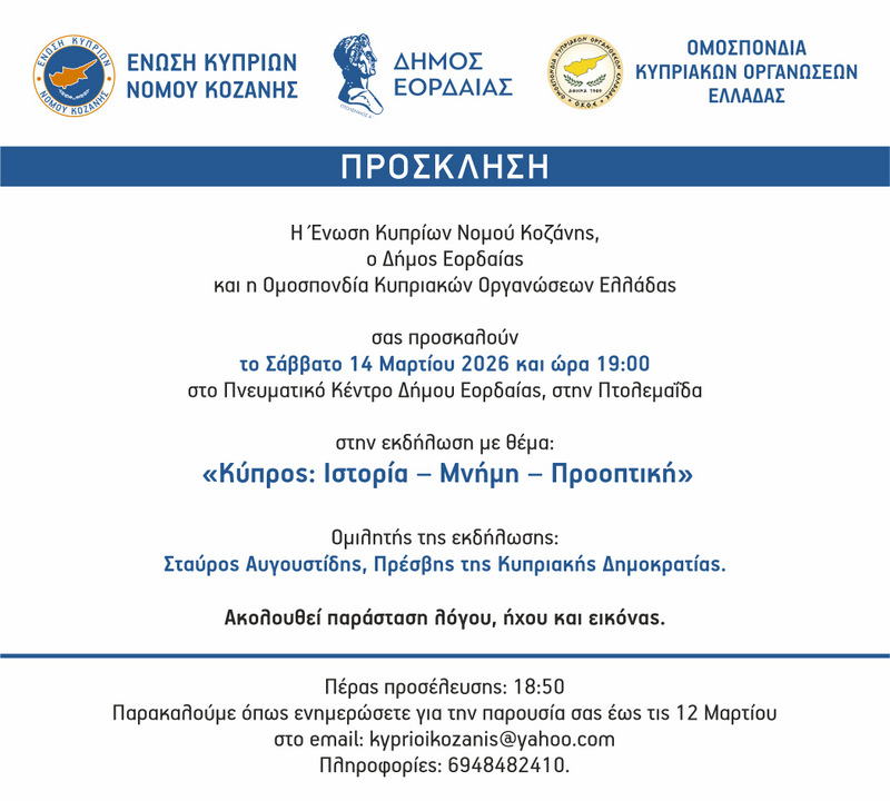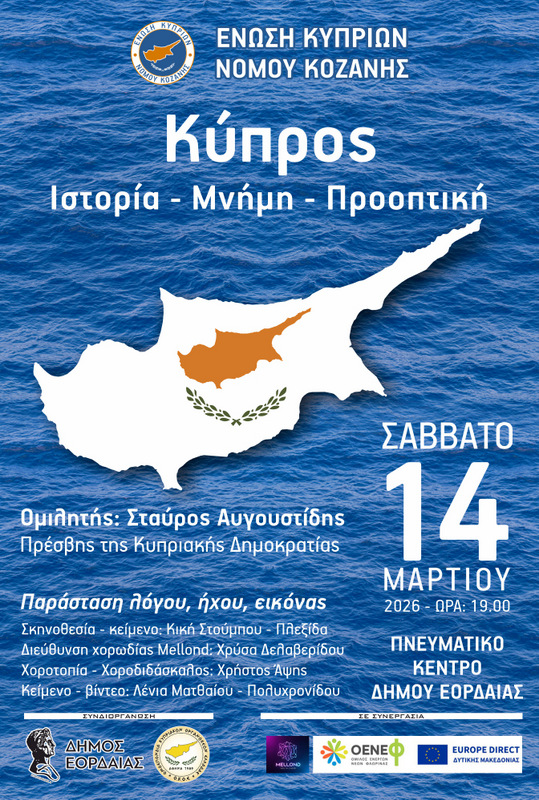 και την Ομοσπονδία Κυπριακών Οργανώσεων Ελλάδας, διοργανώνει το Σάββατο 14 Μαρτίου 2026 και ώρα 19.00 στο Πνευματικό Κέντρο Δήμου Εορδαίας εκδήλωση με θέμα «Κύπρος: Ιστορία, Μνήμη, Προοπτική».