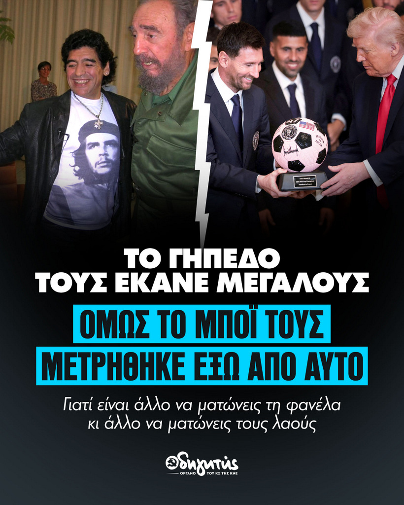 «Με αφορμή τον σάλο που έχει προκληθεί από την κίνηση του Λιονέλ Μέσι και των υπόλοιπων παικτών της Ίντερ Μαϊάμι να χειροκροτήσουν τον Ντόναλντ Τραμπ στο κομμάτι της ομιλίας του για την ιμπεριαλιστική επέμβαση στο Ιράν, αξίζει να κάνουμε μία σύγκριση...», αναφέρει ο «Οδηγητής σε ανάρτηση του.