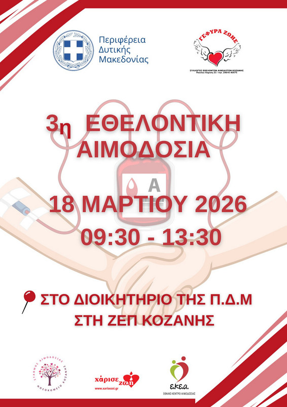 Ο Σύλλογος Εθελοντών Αιμοδοτών Κοζάνης «Γέφυρα Ζωής», σε συνεργασία με την Περιφέρεια Δυτικής Μακεδονίας και το Τμήμα Αιμοδοσίας του Μαμάτσειου Νοσοκομείου Κοζάνης