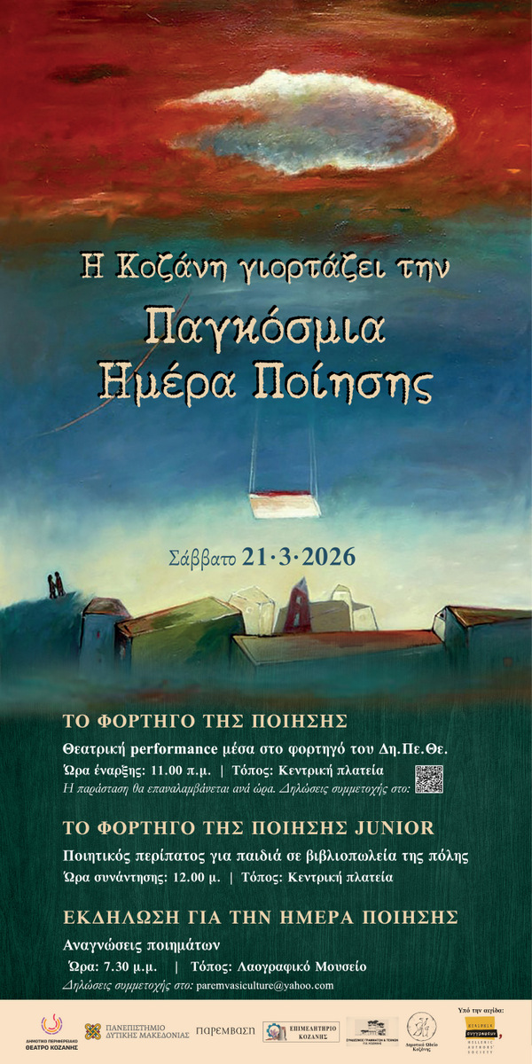 Το απόγευμα της 21ης Μαρτίου, το Λογοτεχνικό Περιοδικό Παρέμβαση, στο Λαογραφικό Μουσείο Κοζάνης, θα πραγματοποιήσει εκδήλωση αφιερωμένη στην Ημέρα Ποίησης. Ηθοποιοί του Δη.Πε.Θε., ποιητές του τόπου και φίλοι της λογοτεχνίας θα διαβάσουν ποιήματα δικά τους ή της επιλογής τους. Μέσα από τη ζωντανή απαγγελία και τη συνάντηση διαφορετικών φωνών, η ποίηση θα βρεθεί στο επίκεντρο, αναδεικνύοντας τη δύναμη του λόγου να συγκινεί και να εμπνέει. Η εκδήλωση θα πραγματοποιηθεί σε συνδιοργάνωση με την Εταιρεία Συγγραφέων, το Δη.Πε.Θε. Κοζάνης και τον Σύνδεσμο Γραμμάτων και Τεχνών. Μουσική: Βαγγέλης Μαραμής. Δηλώσεις συμμετοχής: Αυτή η διεύθυνση ηλεκτρονικού ταχυδρομείου προστατεύεται από τους αυτοματισμούς αποστολέων ανεπιθύμητων μηνυμάτων. Χρειάζεται να ενεργοποιήσετε τη JavaScript για να μπορέσετε να τη δείτε.