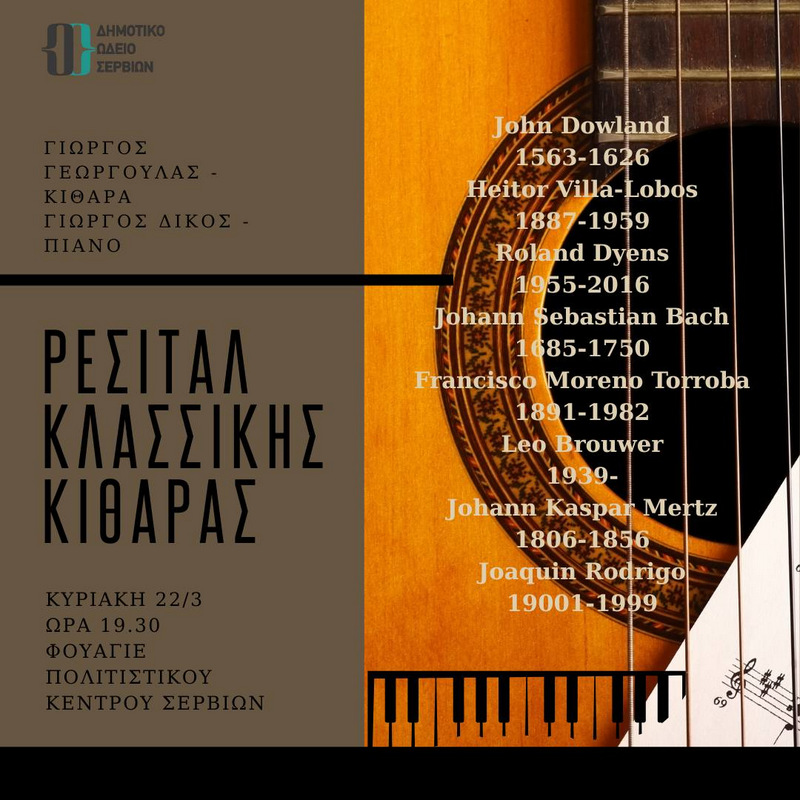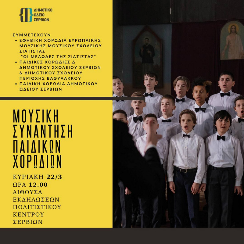 Το Δημοτικό Ωδείο Σερβίων διοργανώνει Μουσικό Διήμερο, το Σάββατο 21 και την Κυριακή 22 Μαρτίου, στο Πολιτιστικό Κέντρο Σερβίων, παρουσιάζοντας ένα πρόγραμμα