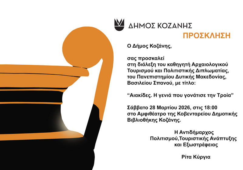 και Πολιτιστικής Διπλωματίας του Πανεπιστημίου Δυτικής Μακεδονίας Βασιλείου Σπανού με τίτλο: «Αιακίδες, η γενιά που γονάτισε την Τροία», η οποία θα πραγματοποιηθεί το Σάββατο 28 Μαρτίου 2026 στις 18:00 το απόγευμα, στο Αμφιθέατρο της Κοβενταρείου Δημοτικής Βιβλιοθήκης Κοζάνης.