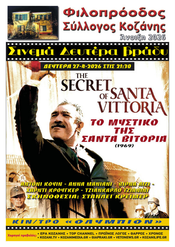 κοζάνη, ειδήσεις, νέα, ΠτολεμαΐδαΟ Φιλοπρόοδος Σύλλογος Κοζάνης παρουσιάζει, αυτή τη Δευτέρα 27 Απριλίου 2026 στην επάνω αίθουσα του κινηματοθέατρου «Ολύμπιον», στις 9:30 το βράδυ, την τελευταία ταινία