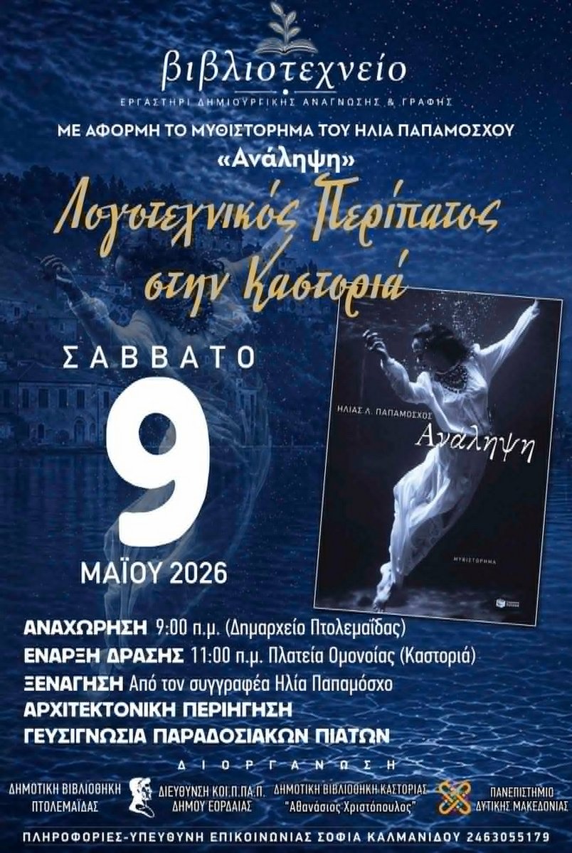 - Περιήγηση με τον συγγραφέα Ηλία Παπαμόσχο: Μια διαδρομή σε σημεία της πόλης που συνδέονται με το κλίμα, τις μνήμες και την εσωτερική γεωγραφία του βιβλίου. Οι αφηγήσεις του θα λειτουργήσουν ως γέφυρα ανάμεσα στο κείμενο και το τοπίο της Καστοριάς.