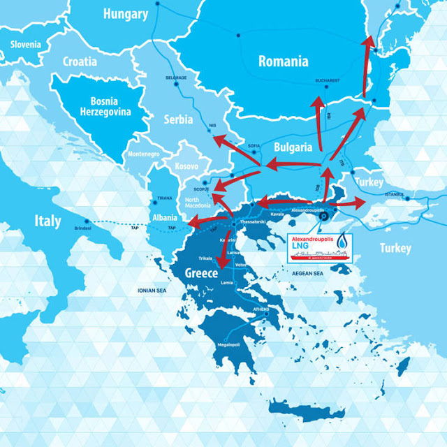 4. Το λιμάνι της Αλεξανδρούπολης βγήκε πριν λίγο καιρό για πώληση μέσω ΤΑΙΠΕΔ. Ο πρέσβης των ΗΠΑ στην Ελλάδα, Τζέφρι Πάιατ, κατά την επίσκεψή του στην Αλεξανδρούπολη δηλώνει ότι «το λιμάνι αυτό είναι στρατηγικής σημασίας για τις ΗΠΑ-ΝΑΤΟ και είναι βέβαιος πως θα υπάρξει ενδιαφέρον για εξαγορά από αμερικάνικες εταιρείες.» [25] Και φυσικά καθόλου τυχαία, ο όμιλος Κοπελούζου ξεκίνησε εκεί την κατασκευή μονάδας ηλεκτροπαραγωγής ισχύος 660 MW με καύσιμο φυσικό αέριο η οποία «θα συνδέεται μέσω ιδιόκτητου αγωγού 4 περίπου χιλιομέτρων με το FSRU της Αλεξανδρούπολης»… [26]
