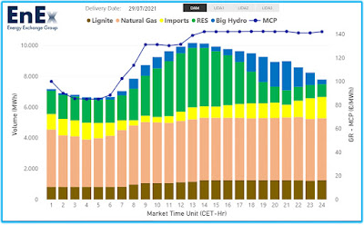Κατόπιν αυτού η τιμή επόμενης ημέρας στο Χρηματιστήριο Αθηνών ξεπέρασε αισίως τα 142€/Mwh για τις μεσημβρινές ώρες της 29/7/2021 και, βεβαίως, αναμένονται ακόμα πιο υψηλές μέγιστες τιμές τις επόμενες ημέρες, καθώς η πρόβλεψη είναι πως η επόμενη Δευτέρα, 2/8, θα είναι η πιο ζεστή ημέρα. Το πολύ ενδιαφέρον στο διάγραμμα είναι πως τις νυχτερινές ώρες, που η ζήτηση ηλεκτρισμού μειώνεται, η τιμή είναι οριακά κάτω απ' τα 85€/Mwh! Ρίξ 'τε μια ματιά στα συμβόλαια που έχετε με τους παρόχους σας, να δείτε σε ποια τιμή δεν πληρώνετε Ρήτρα Οριακής Τιμής Συστήματος: στα 48; Στα 50 ίσως; Στα 60, στην καλύτερη περίπτωση;