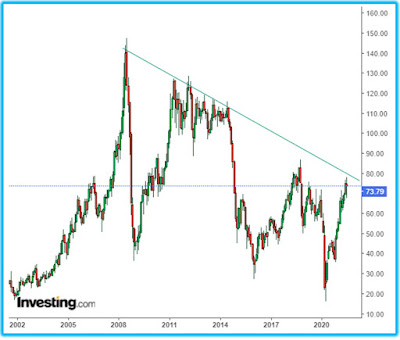 Κι από κοντά κι η τιμή του πετρελαίου, να απειλεί να σπάσει τη μακροχρόνια καθοδική γραμμή τάσης, που βλέπουμε στο διάγραμμα για την τιμή του συμβολαίου μπρεντ ενός μήνα. Δεν θα θέλαμε με τίποτα να δούμε το 8 μπροστά απ' την τιμή, πολύ περισσότερο το 9: δεν θα υπάρχει πλέον άνω όριο για την τιμή και για μια ενεργειακά πλήρως εξαρτημένη οικονομία, όπως έκανε την Ελλάδα ο Μητσοτάκης, θα είναι το τελευταίο καρφί στο φέρετρο.
